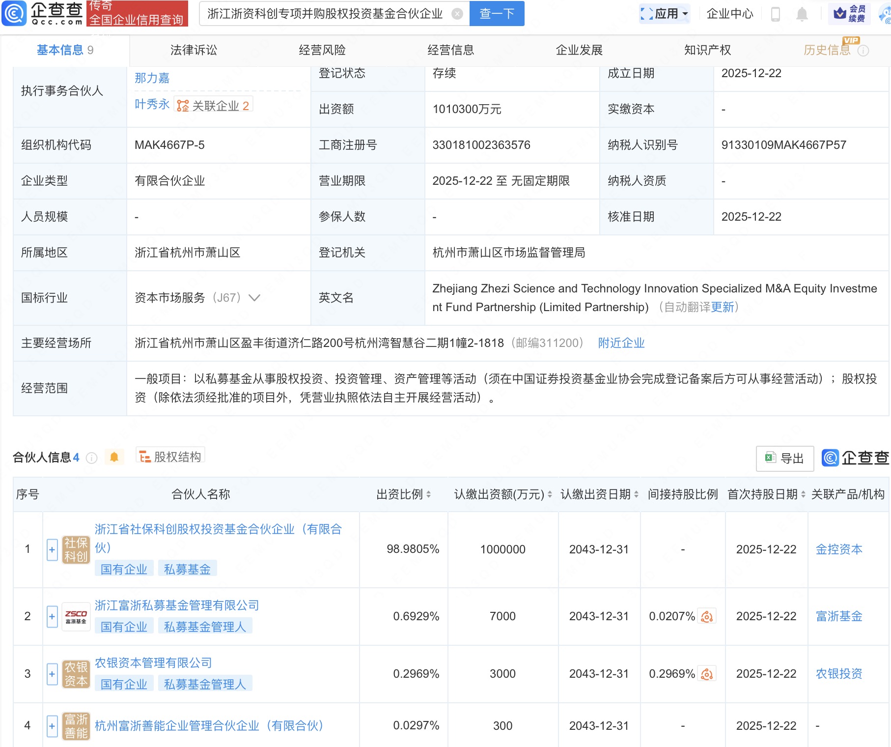 近日,浙江浙资科创专项并购股权投资基金合伙企业(有限合伙)成立,出资额101.03亿元,经营范围为以私募基金从事股权投资、投资管理、资产管理等活动。企查查股权穿透显示,该企业由浙江省社保科创股权投资基金合伙企业(有限合伙)、浙江富浙私募基金管理有限公司等共同出资。