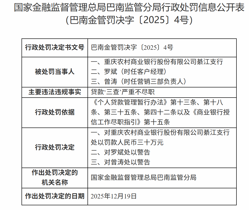 12月25日,国家金融监督管理总局巴南监管分局行政处罚信息公开表显示,重庆农村商业银行股份有限公司綦江支行因贷款“三查”严重不尽职被罚款人民币三十万元;罗某、曾某被警告。